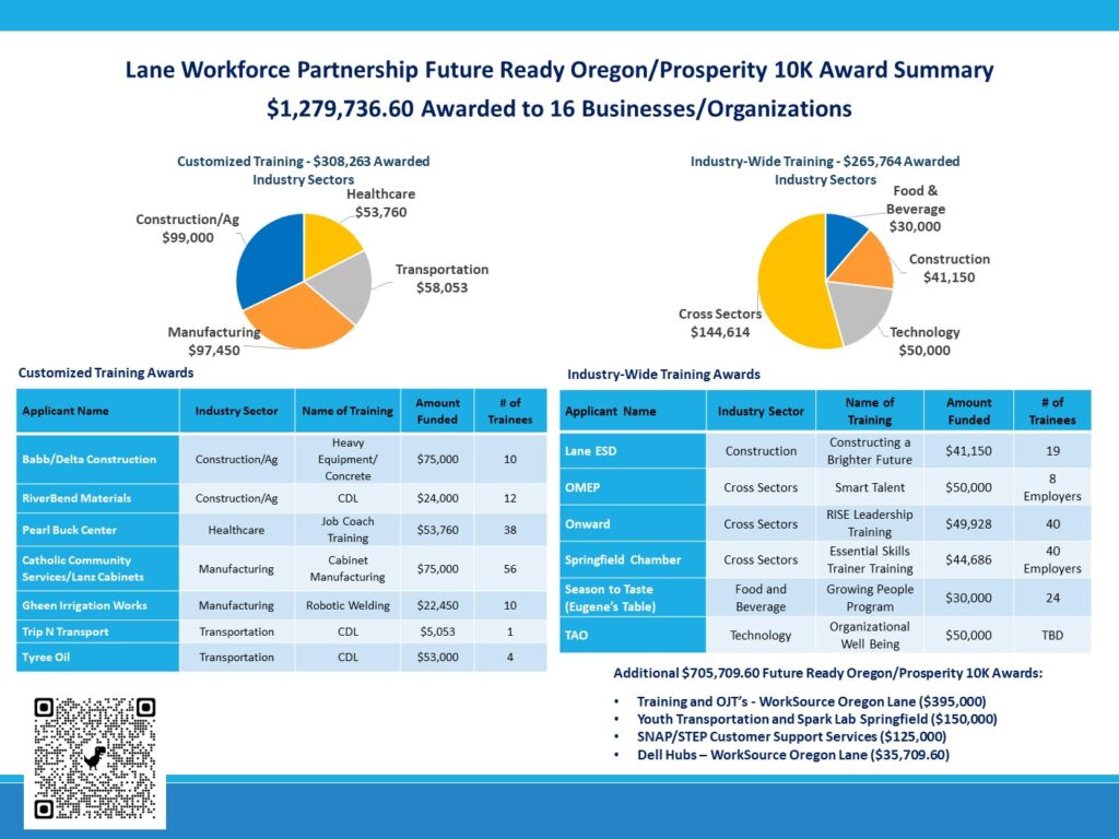 The Oregon Prosperity 10,000 Program drives growth and prosperity in Lane County by supporting private sector businesses and enhancing workforce skills through upskilling and retraining initiatives. Lane Workforce Partnership implemented two key strategies: Customized Training Solutions, which provides skill-enhancing training tailored to local businesses’ needs, and Industry-wide Employer Training, which empowers employers to facilitate targeted training sessions for workforce engagement and retention.